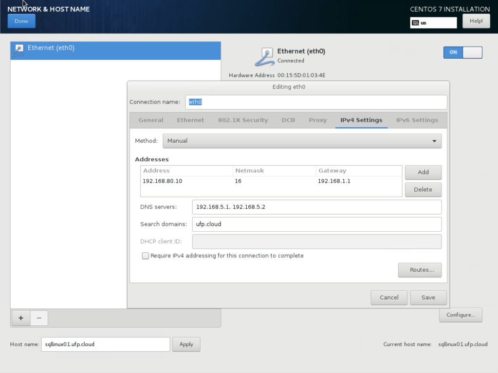 - All IP, DNS, Hostname, and Search domain configuration done during installation ( screen shot below)