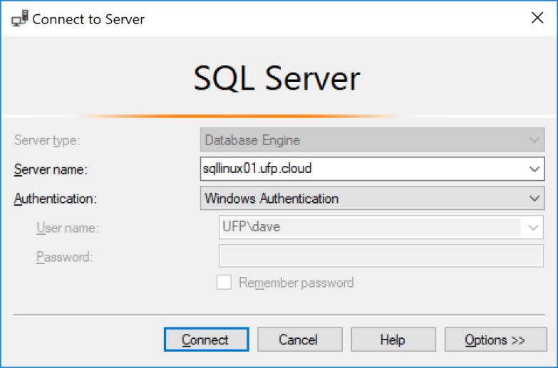 When we connect to this server from now on, we need to make sure we need to that we use the fully qualified domain name, otherwise we’ll have errors when trying to connect with windows authorization. In our case it’s sqllinux01.ufp.cloud.