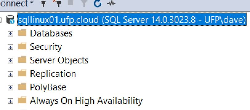 C:\WINDOWS\system32>sqlcmd -S sqllinux01.ufp.cloud -Usa -p Password: 1> USE [master] 2> GO Changed database context to 'master'. 1> CREATE LOGIN [UFP\dave] FROM WINDOWS WITH DEFAULT_DATABASE=[master] 2> GO 1> ALTER SERVER ROLE [sysadmin] ADD MEMBER [UFP\dave] 2> GO